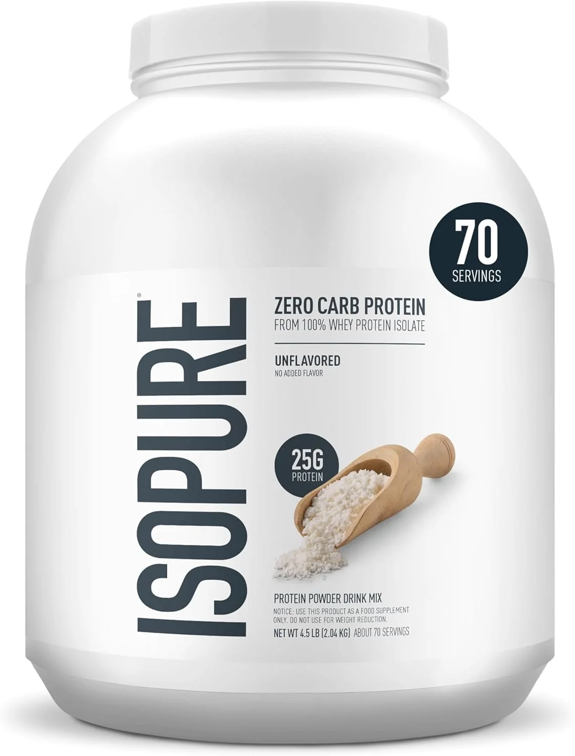 Whey Protein Isolate - Unflavoured 25 g protein per scoop (start with 1/2 scoop for 12-13g) Contains soy lecithin (emulsifier)